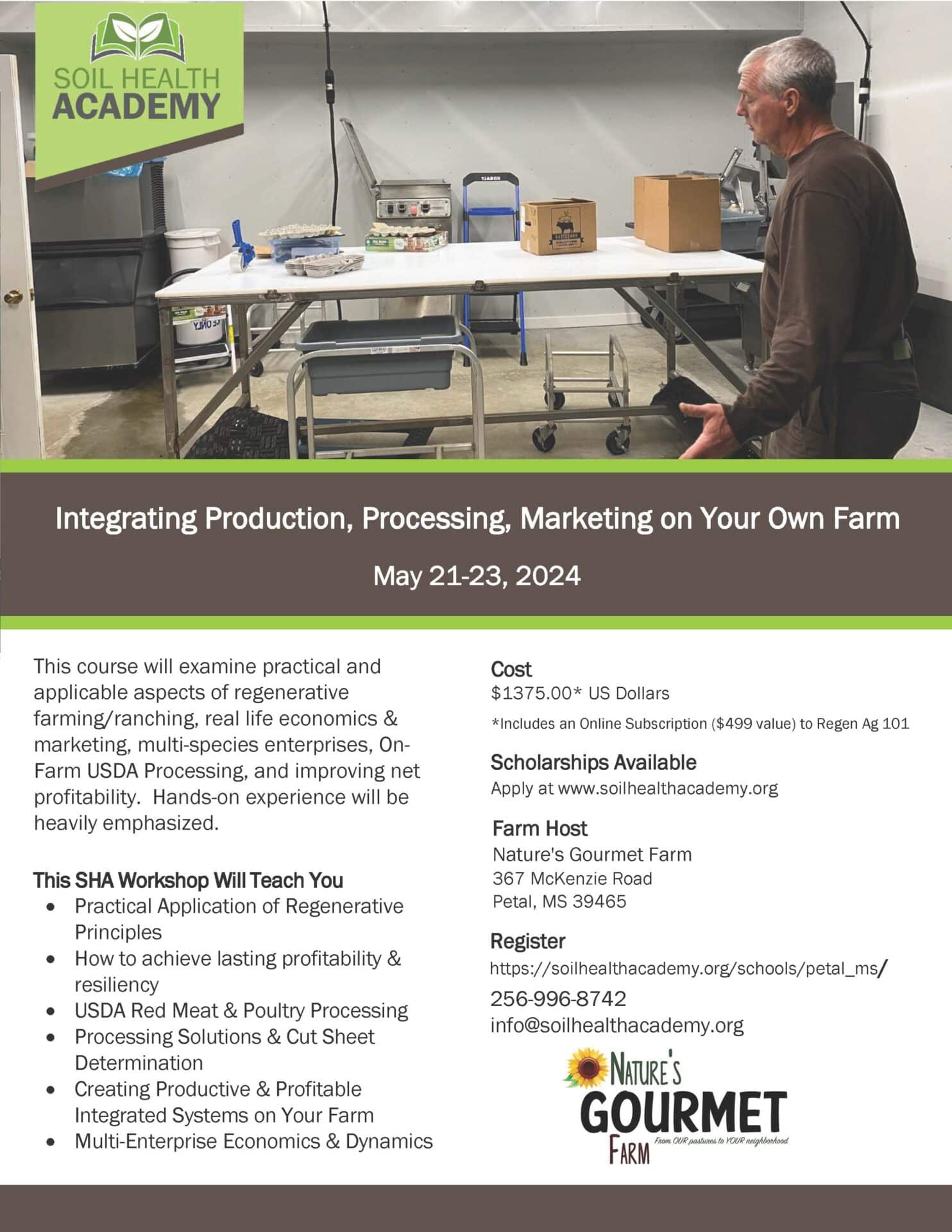 Anyone wanting to take their farm or ranch to the next level. This course will examine practical and applicable aspects of regenerative farming/ranching, real life economics & marketing, multi-species enterprises, On-Farm USDA Processing, and improving net profitability. Hands-on experience will be heavily emphasized.